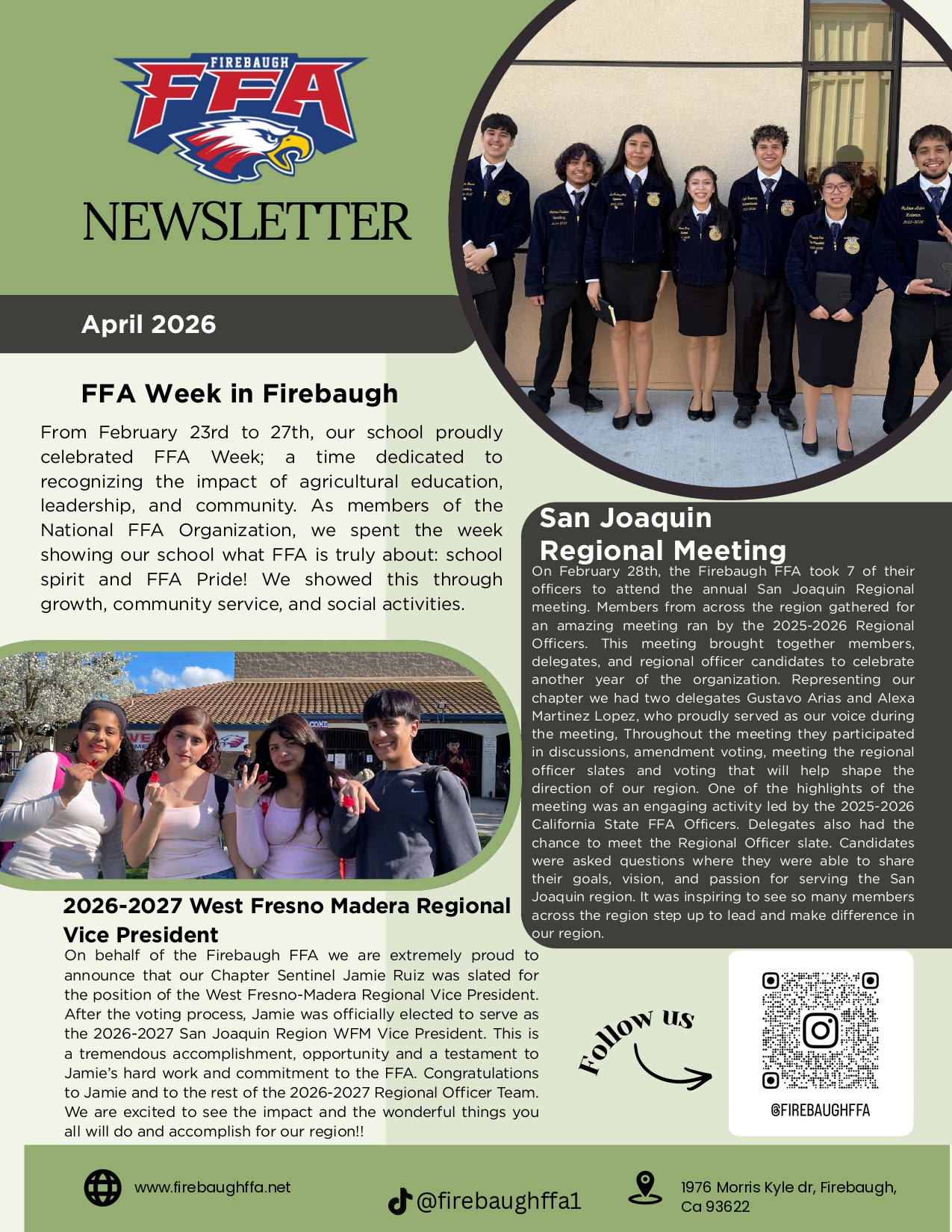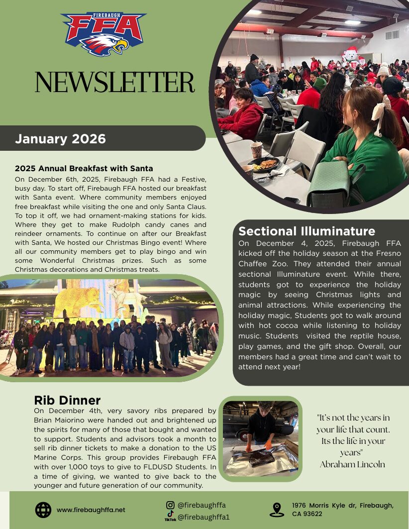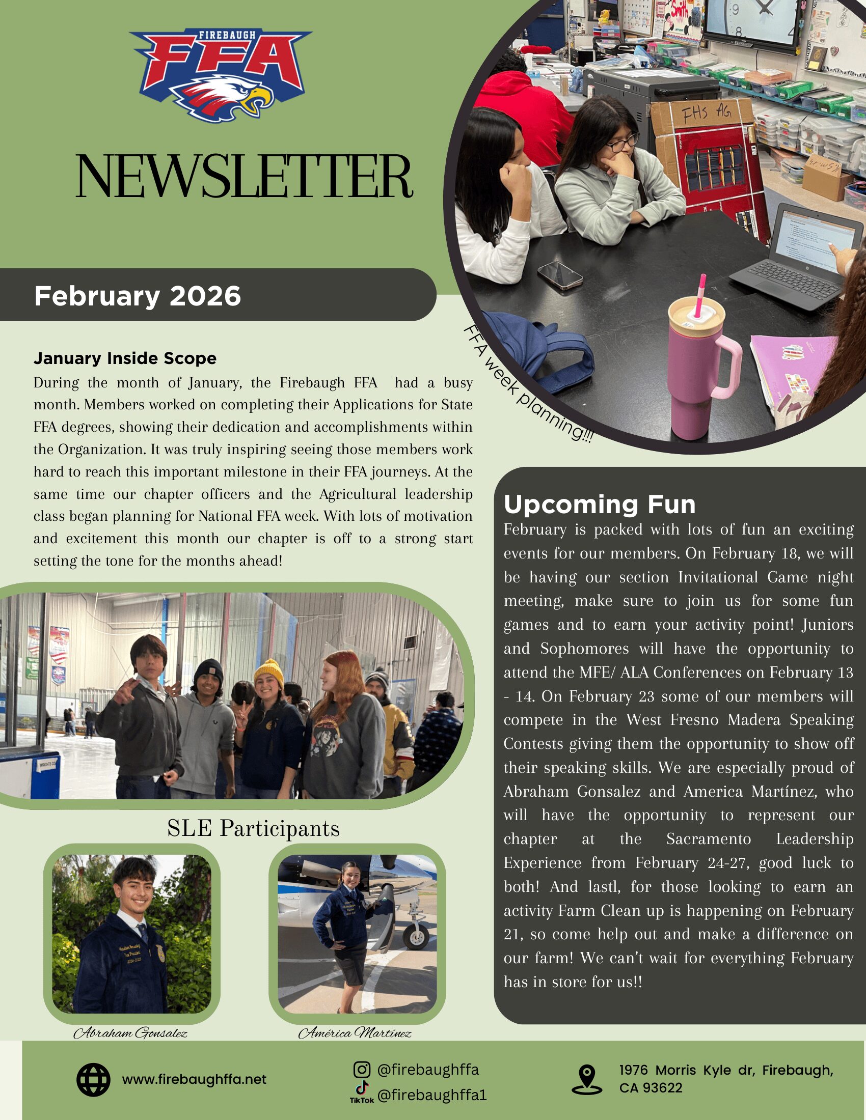 On our brand-new Firebaugh FFA Website, you will find anything that a Firebaugh FFA member needs to get through their stay in FFA. This page includes information such as information on contests like CDE’s or events such as LDE’s. This website had our chapter history such as degree recipients, past FFA activities, and so much more! It also hosts current news articles created by your chapter reporter informing all of us about the new upcoming FFA events within our chapter, section, region, and our beloved state! We encourage you to look around and website and browse. You might learn a thing or two about FFA, your chapter officers, or maybe your advisors.
