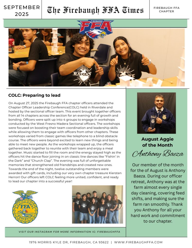 On our website you will find just about everything you need to know about our chapter. Everything from the History of Firebaugh FFA to current events taking place within our chapter or even our section maybe higher. We encourage you to take a look around our website and browse through our many photos of events and activities, take a look at our members achievements, or even get to know our Chapter Officer team a little more.